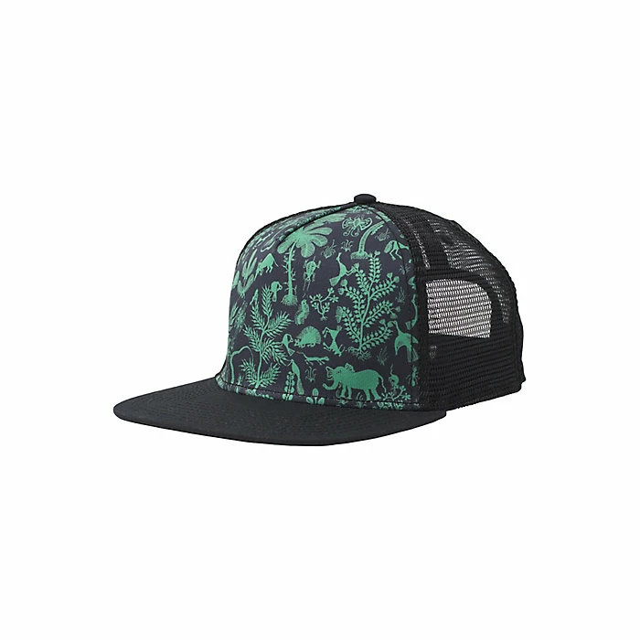 - Black Rahesh: Recycled polyester mesh and organic cotton canvas on visor of trucker with various graphic on front panel